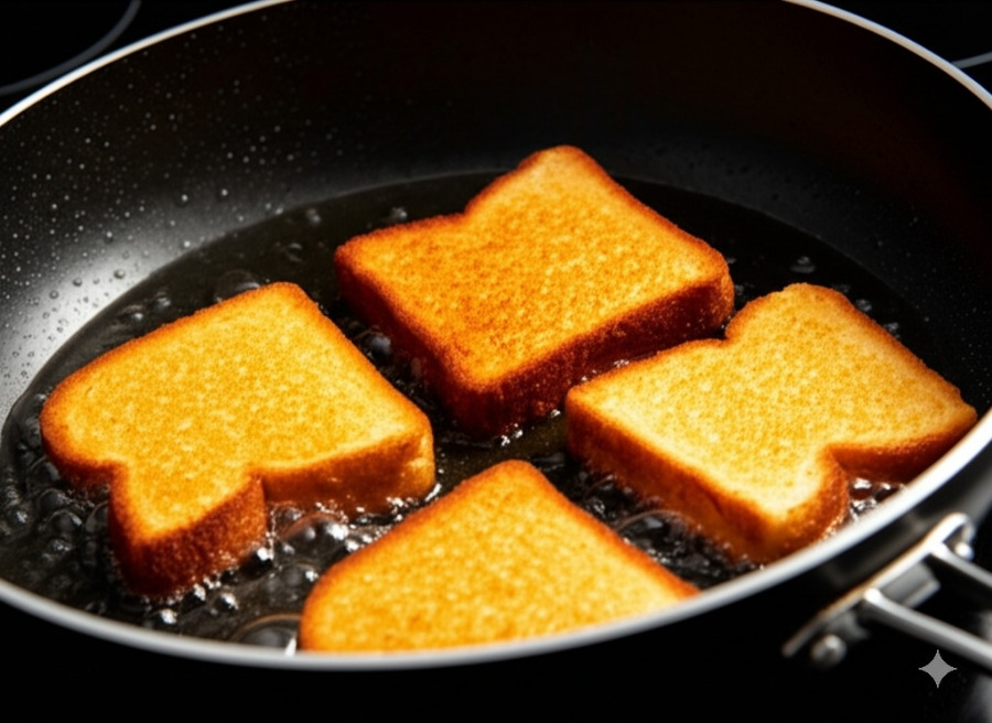 냄비나 깊은 팬에 식용유를 넉넉히 넣고 160170℃ 정도로 예열합니다. (빵 조각을 살짝 넣었을 때 23초 후에 떠오르는 온도)