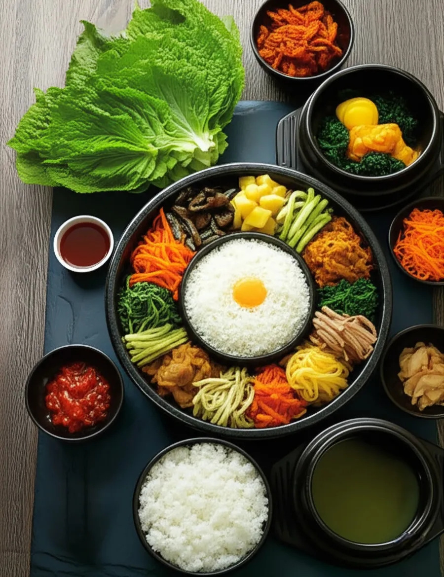 <이미지: 신선한 쌈 채소와 푸짐한 반찬들이 가득한 쌈밥 한 상>