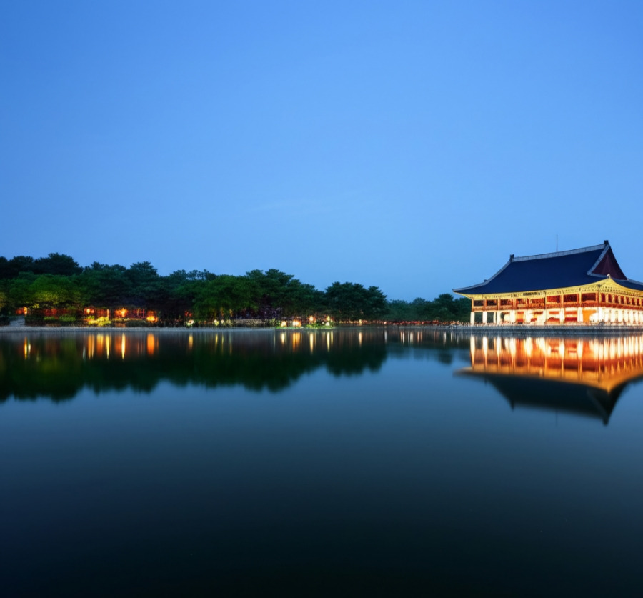 <이미지: 조명이 켜진 동궁과 월지의 아름다운 야경과 연못에 비친 반영>