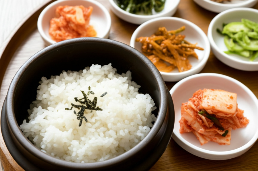 <이미지: 맛깔스러운 반찬과 함께 차려진 한국식 백반>