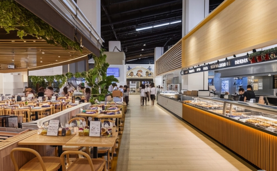 <이미지: 아울렛 푸드코트 또는 주변 식당의 다양한 점심 메뉴>