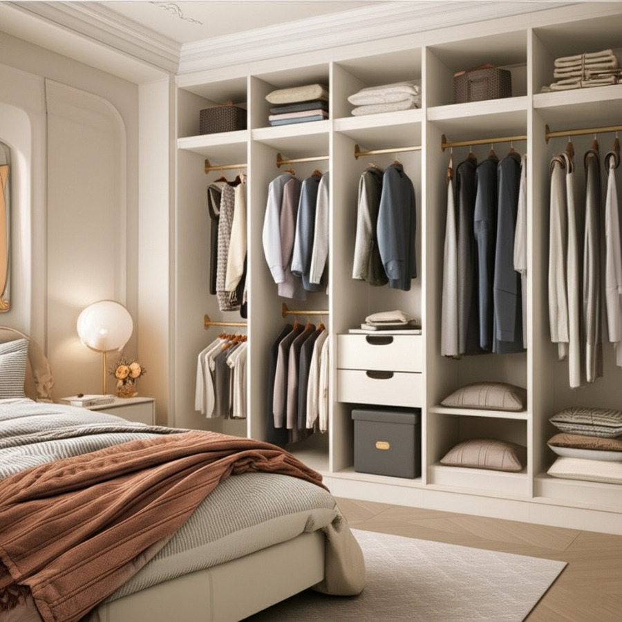 * 모듈 가구 (붙박이장형): 깔끔하고 정돈된 느낌을 주며, 옷을 먼지로부터 보호하는 데 유리합니다. 빌트인 느낌으로 공간에 딱 맞춰 설치할 수 있습니다.