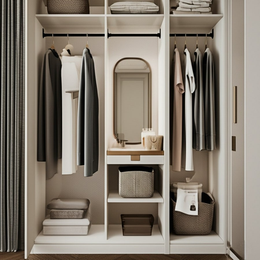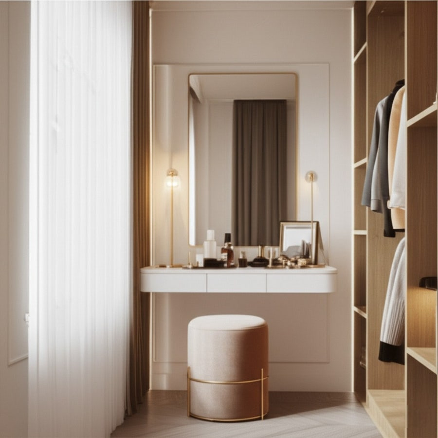 거울 및 파우더 공간 확보: 옷을 입어보고 전체적인 스타일을 확인하기 위한 전신 거울은 필수입니다. 가능하다면 작은 파우더 공간이나 앉아서 신발을 신을 수 있는 공간을 마련하여 편리함을 더합니다.