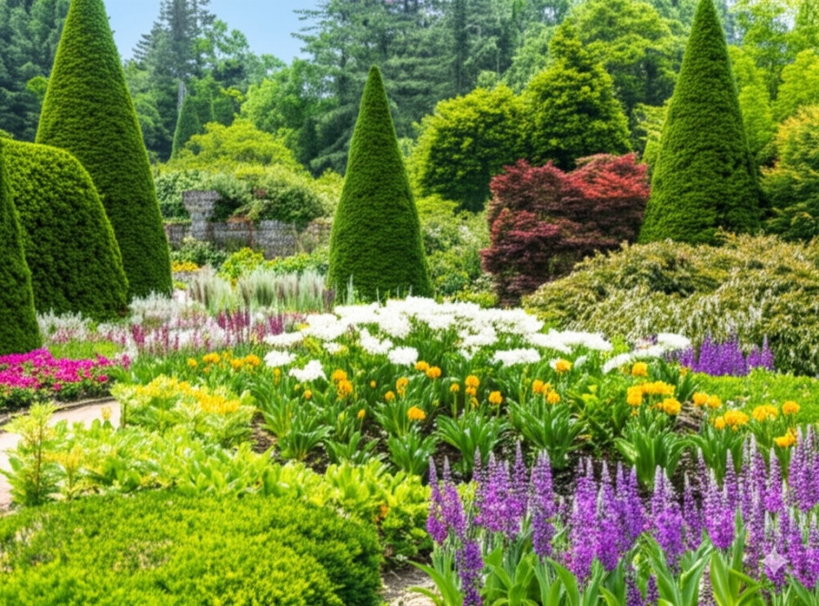 <이미지: 다양한 꽃과 나무, 유럽풍 건축물이 어우러진 제이드가든의 아름다운 풍경 사진>
