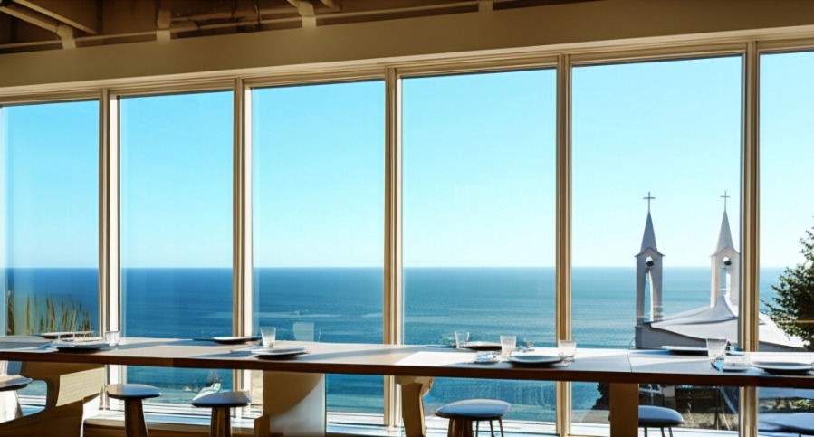 <이미지: 통유리창을 통해 푸른 서해 바다가 시원하게 보이는 해어름카페의 세련된 모습>