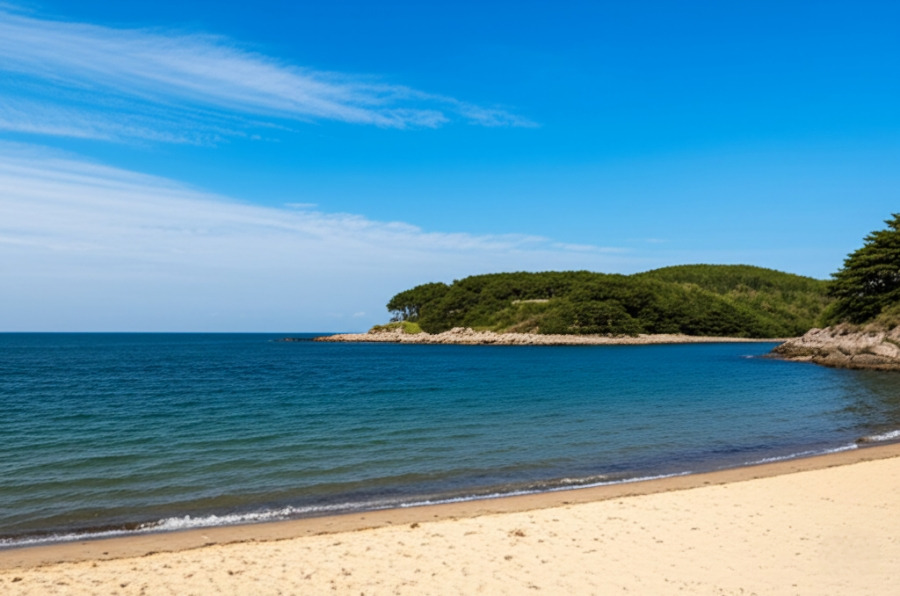 <이미지: 잔잔한 서해 바다와 아늑한 백사장을 가진 국화도의 평화로운 풍경>