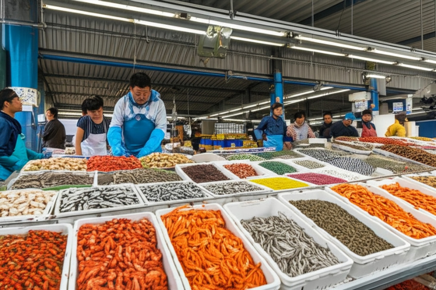 <이미지: 싱싱한 실치와 꽃게가 가득한 장고항 어판장의 활기찬 모습>