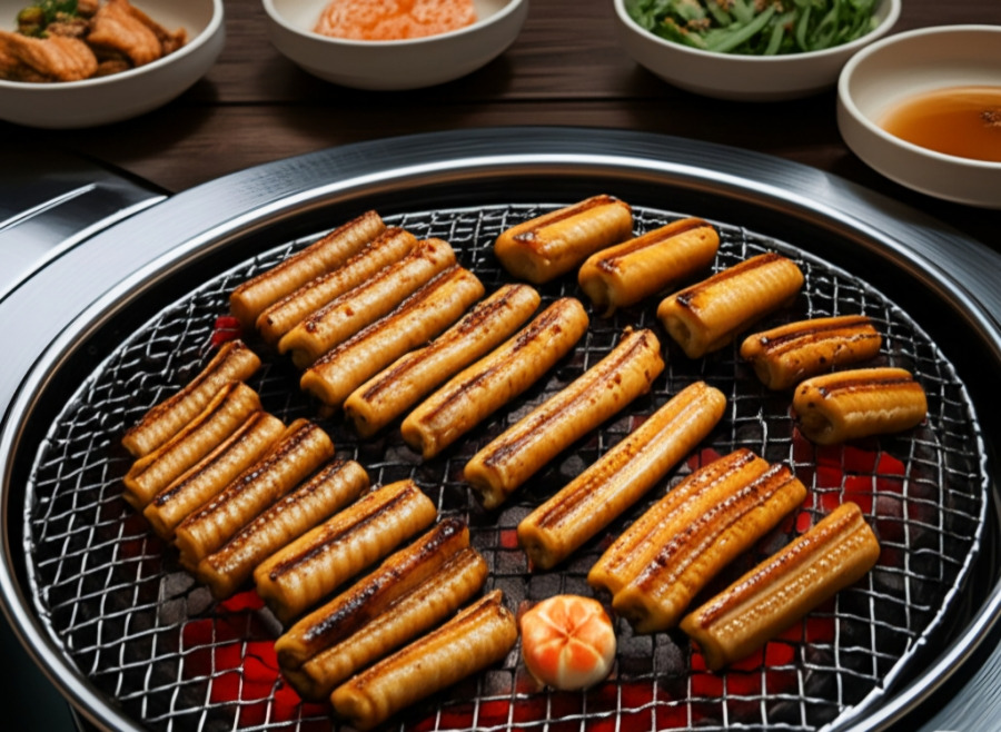 <이미지: 노릇하게 구워진 아나고와 다양한 밑반찬이 놓인 당진의 한 식당 풍경>