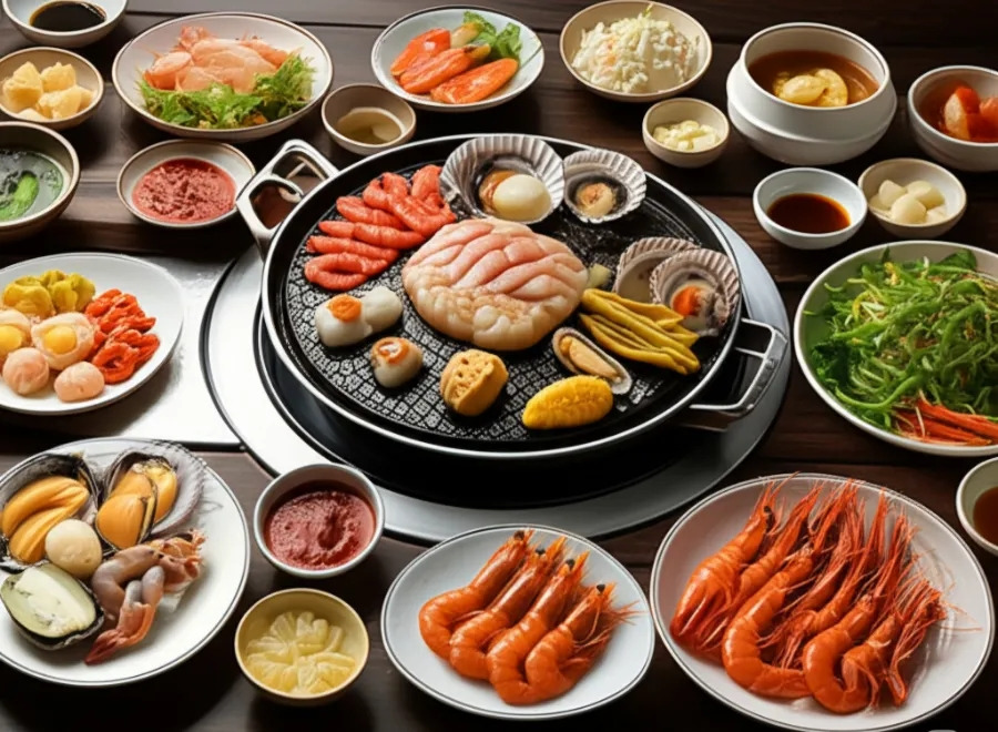 <이미지: 푸짐하게 구워진 조개와 싱싱한 해산물이 차려진 삽교호의 한 식당 풍경>