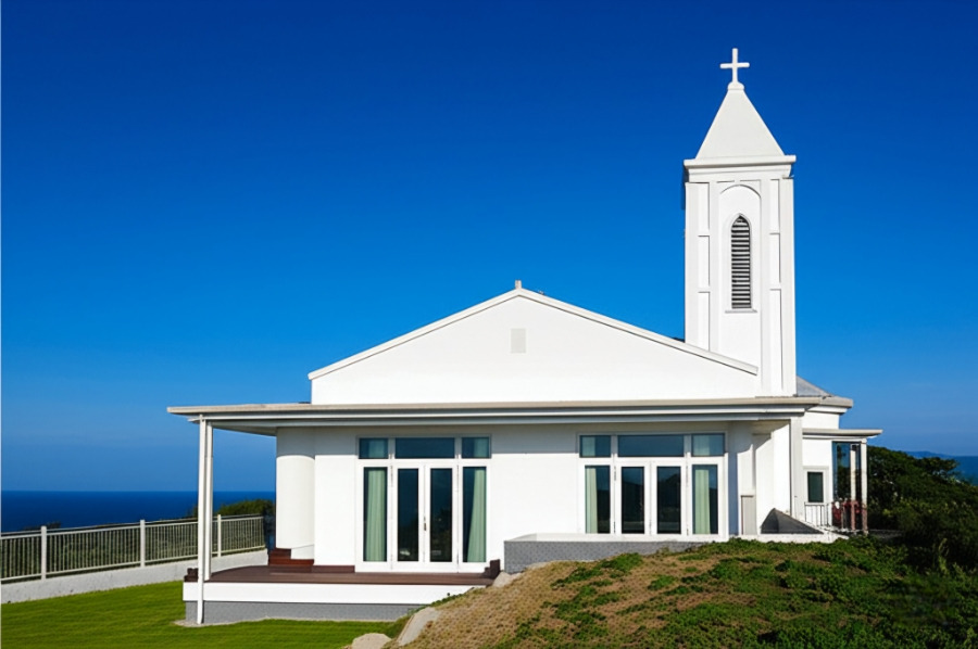 <이미지: 푸른 서해 바다가 시원하게 펼쳐지는 언덕 위의 신리성지 성당>