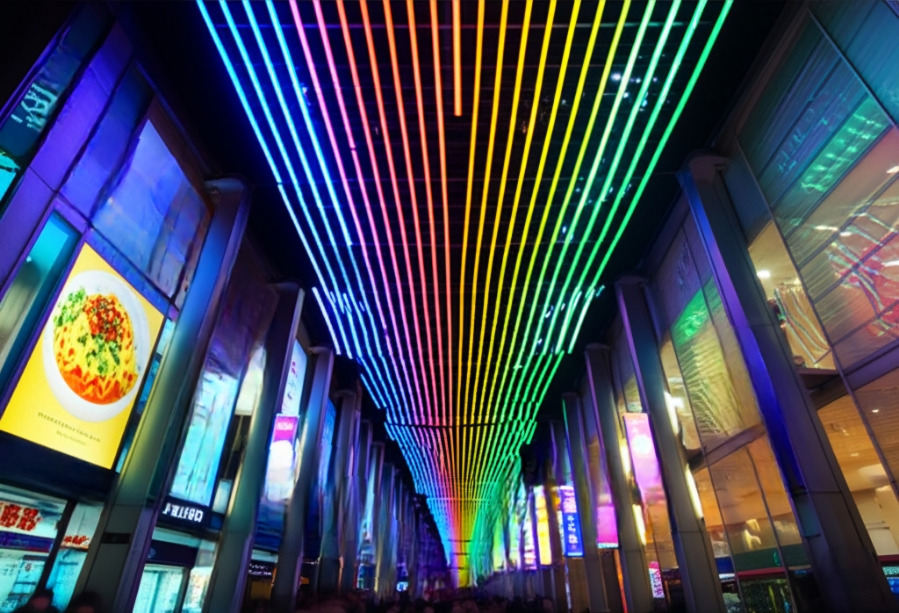 <이미지: 밤에 화려한 영상이 상영되는 으능정이 스카이로드 아래 거리 모습>
