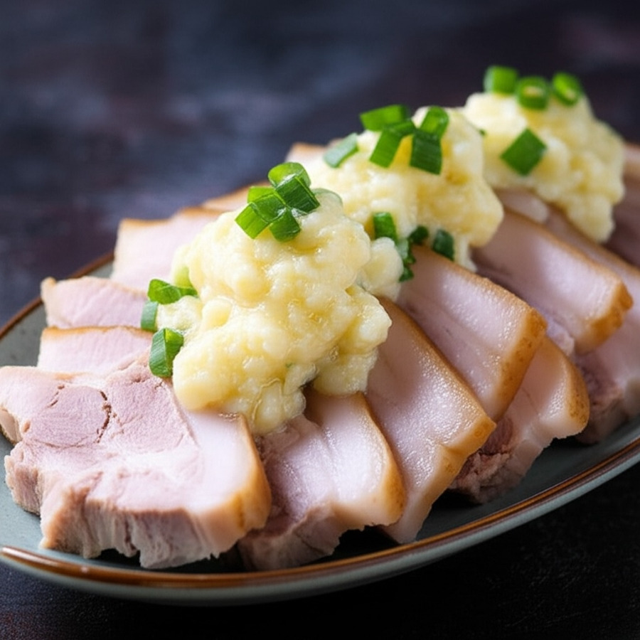 <이미지: 접시에 예쁘게 담긴 마늘보쌈. 윤기 나는 수육 위에 노란빛의 마늘 소스가 듬뿍 얹혀 있고, 옆에는 쌈무, 절임배추, 쌈채소 등이 함께 놓여 있어 먹음직스러워 보이는 모습.>