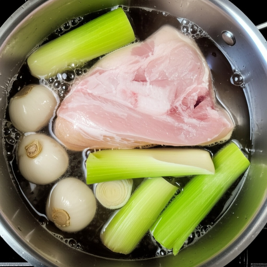 ② 넉넉한 크기의 냄비에 물을 충분히 붓고, [고기 삶을 때 재료]를 모두 넣은 후 센 불로 끓입니다.