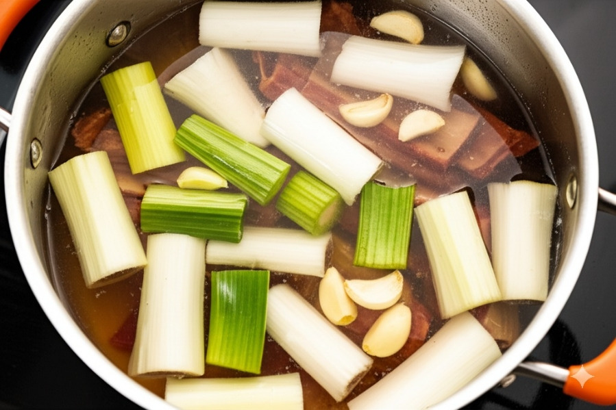 대파 (흰 부분 위주)와 마늘을 통째로 넣고 센 불에서 끓여줍니다. 끓어오르면 거품을 걷어내고 중불로 줄여 1시간 이상 푹 끓여줍니다. 뚜껑을 살짝 열고 끓이면 잡내가 날아갑니다.