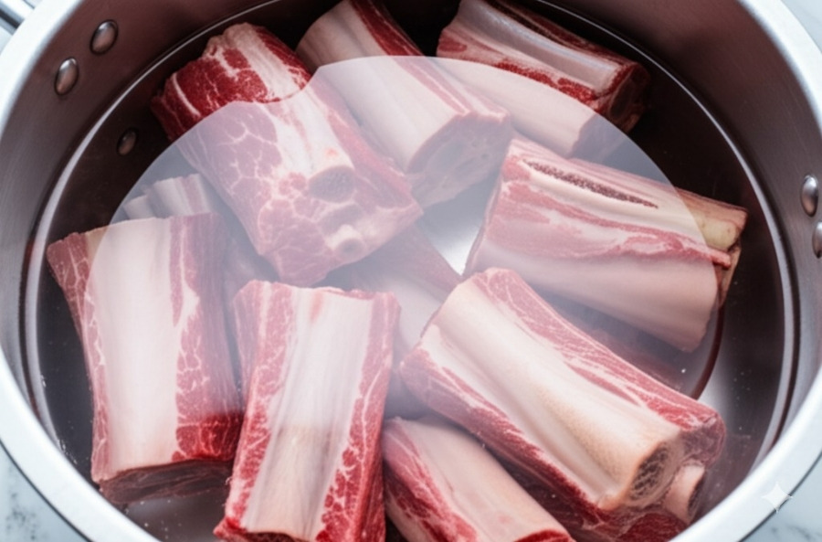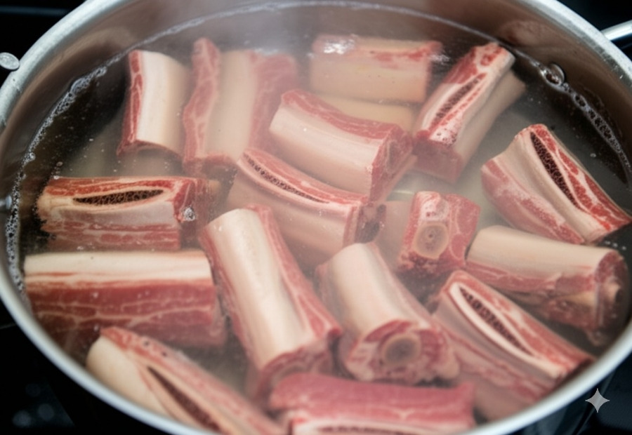 **<이미지: 끓는 물에 소갈비를 넣고 데치는 모습>**