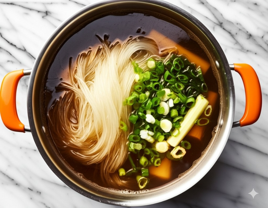 **<이미지: 불린 당면을 넣고 끓이는 모습>**