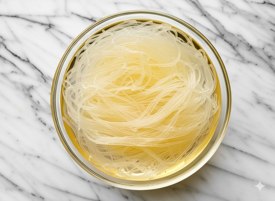 **<이미지: 찬물에 당면을 불리는 모습>**