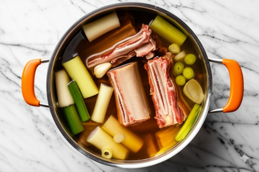 **<이미지: 육수가 뽀얗게 우러난 모습, 건더기를 건져내는 모습 포함>**