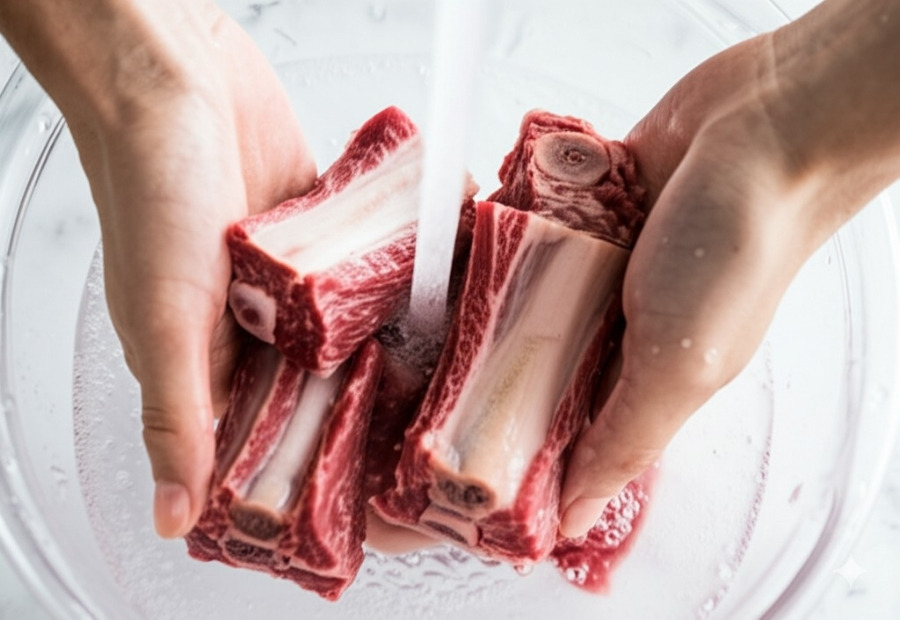 **<이미지: 데친 소갈비를 찬물에 헹구는 모습>**