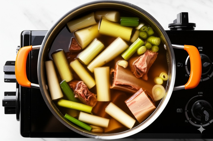 **<이미지: 갈비 육수에 무를 넣고 끓이는 모습>**