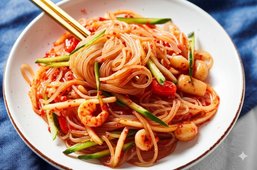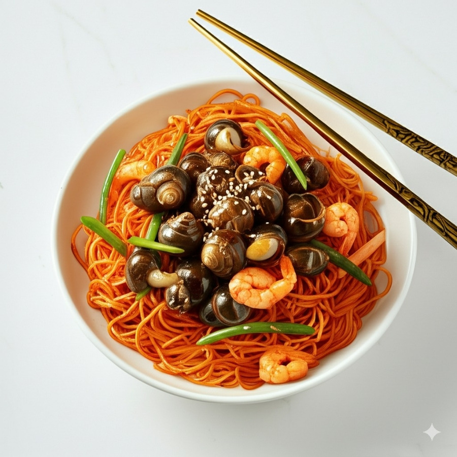 **<이미지: 윤기 흐르는 골뱅이무침 (골뱅이, 소면, 채소들이 매콤한 양념에 버무려진 클로즈업 사진)>**