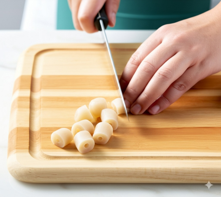 **<이미지: 골뱅이를 도마에 놓고 칼로 썰고 있는 모습>**