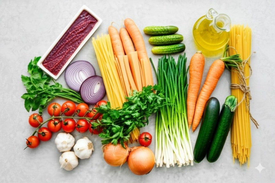 알록달록 신선한 재료들이 맛있는 파스타를 기대하게 만드네요!