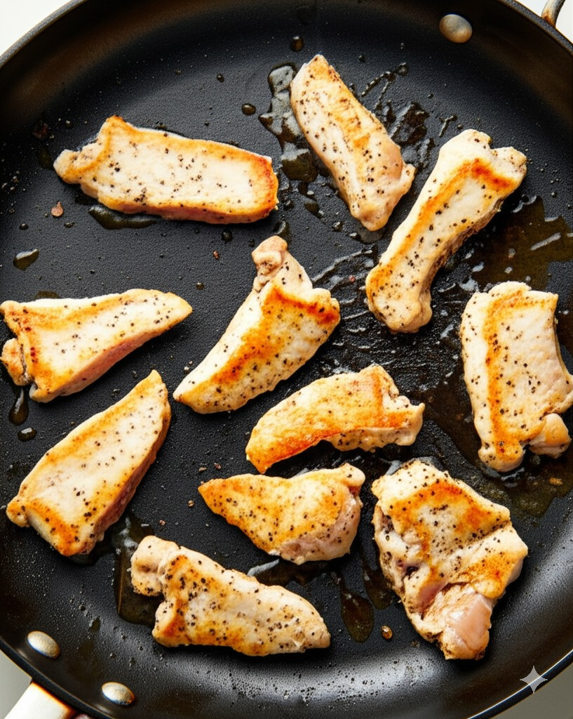 * 중불로 달군 팬에 식용유를 두르고 마리네이드 된 닭고기를 넣어 겉면이 노릇하게 익을 때까지 볶아줍니다.