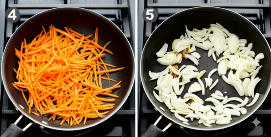 <이미지: 팬에 양파와 당근을 볶는 모습>