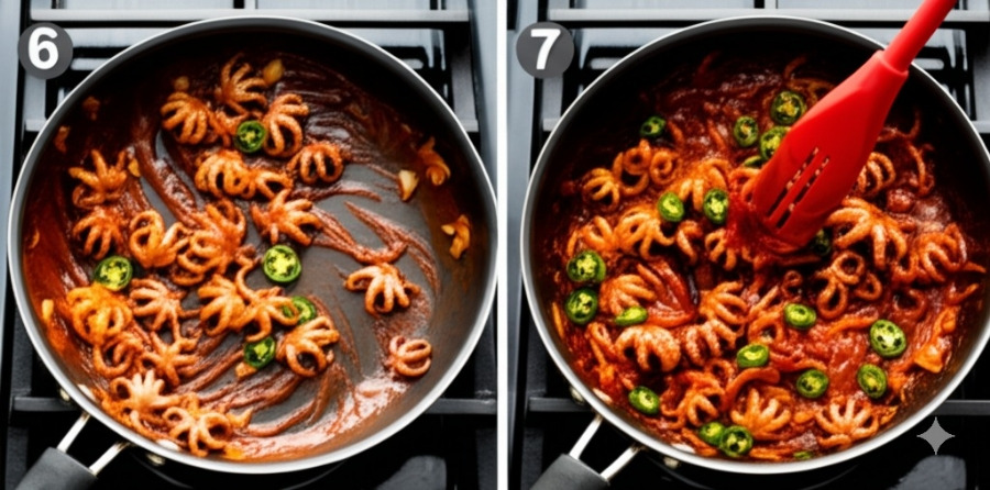 <이미지: 팬에 쭈꾸미와 나머지 채소, 양념을 넣고 볶는 모습>