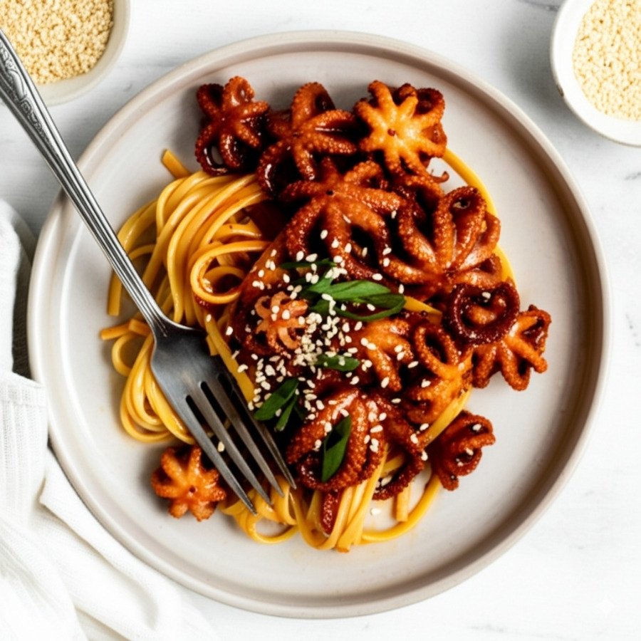 <이미지: 완성된 쭈꾸미볶음을 접시에 담고 통깨를 뿌리는 모습>