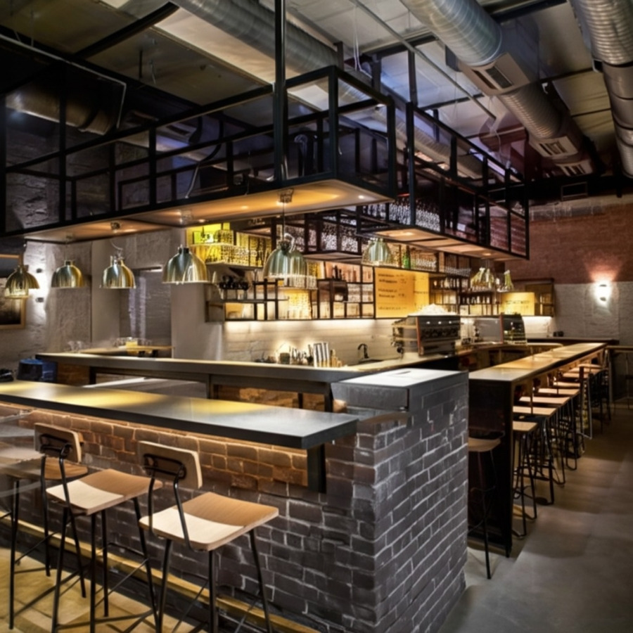 <이미지: 노출 콘크리트 벽과 금속 가구, 빈티지 조명이 어우러진 인더스트리얼 스타일 카페>