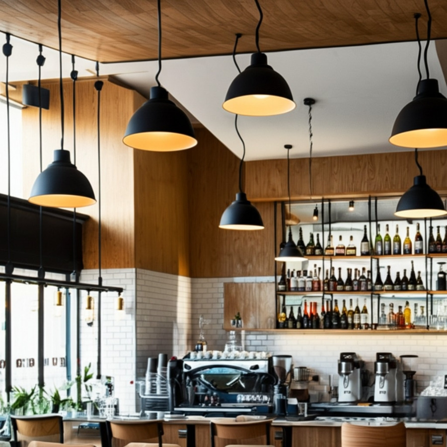 <이미지: 다양한 종류의 카페 조명이 설치된 모습 (펜던트 조명, 스탠드 조명, 레일 조명, 간접 조명 등)>