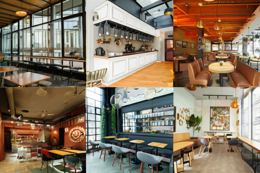 <이미지: 다양한 컬러 팔레트의 카페 인테리어 예시>