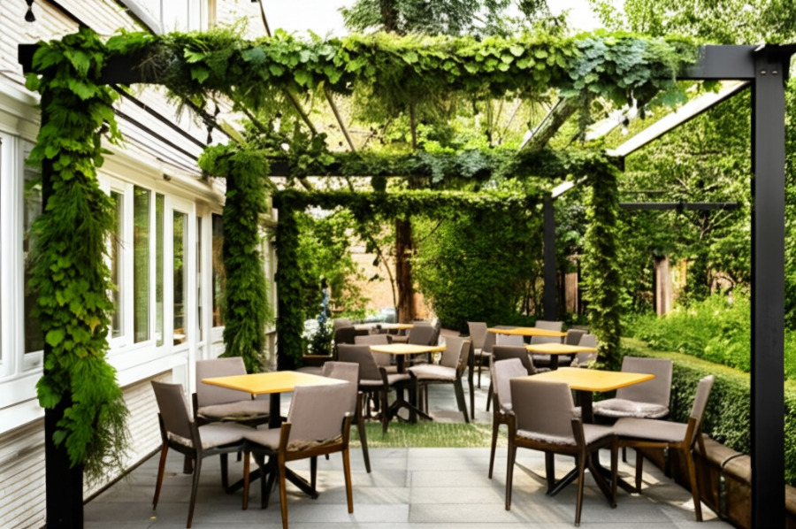 <이미지: 아늑하게 꾸며진 카페 테라스 또는 야외 좌석 공간>