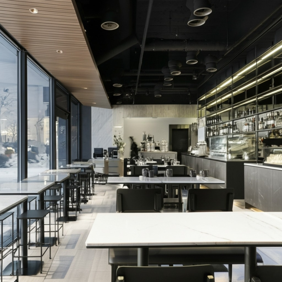 좌석 배치: 1인석, 2인석, 단체석, 바 테이블, 창가 좌석 등 다양한 형태의 좌석을 구성하여 다양한 고객의 니즈를 충족시키고 공간 활용도를 높입니다. 좌석 간 간격과 테이블 크기도 고려해야 합니다.