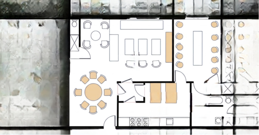 <이미지: 카페 평면도 예시 (주문 공간, 바, 테이블 배치, 화장실 표시)>