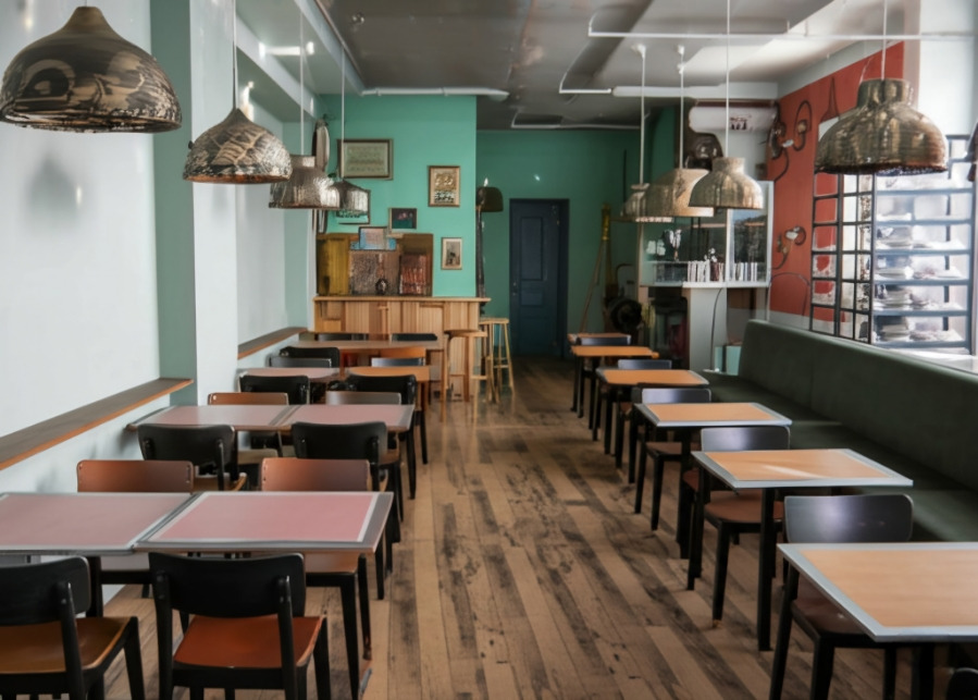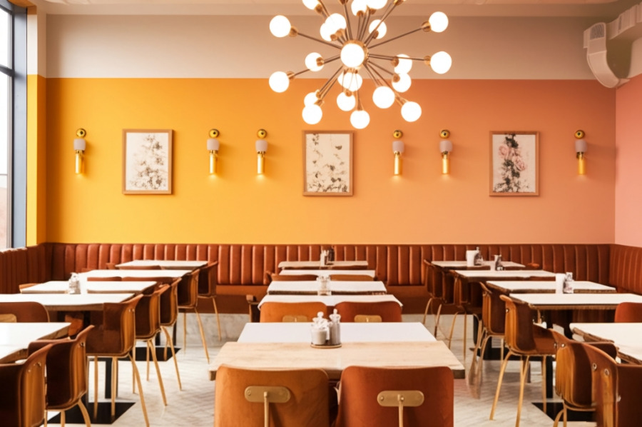 <이미지: 다양한 컬러 팔레트의 카페 인테리어 예시>