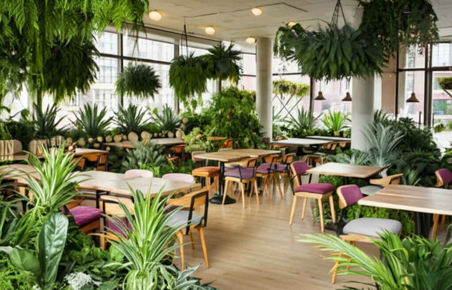 <이미지: 다양한 식물과 우드 소재 가구로 꾸며진 플랜테리어 스타일 카페>