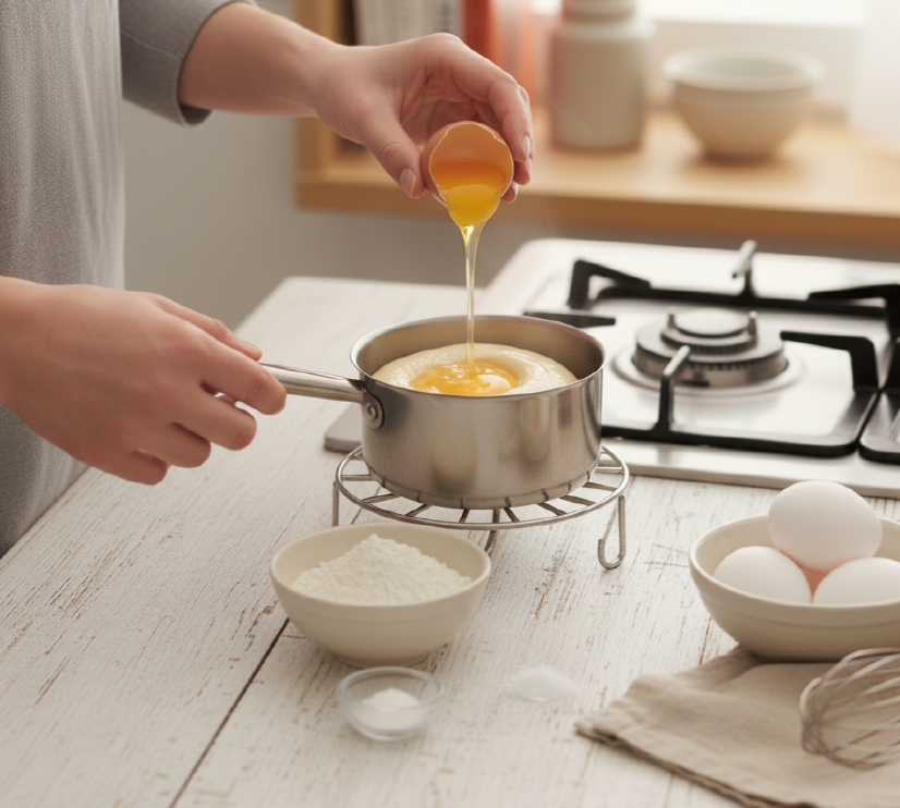 - 끓이기: 우유를 섞은 노른자 반죽을 다시 남은 우유가 있는 냄비에 붓고, 중불에서 바닥이 눌어붙지 않도록 계속 저어가며 걸쭉하게 끓입니다. (크림이 '푸딩'처럼 되직해질 때까지!)