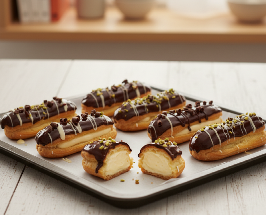 - 마무리: 취향에 따라 피스타치오, 견과류, 초콜릿 컬 등으로 장식하면 더욱 먹음직스러운 에끌레르가 완성됩니다!