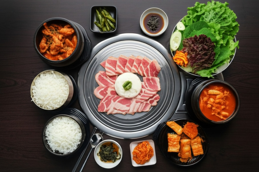<이미지: 노릇하게 구워지고 있는 문경 약돌돼지 구이와 밑반찬>