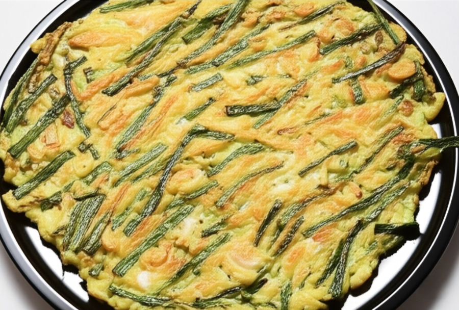 <이미지: 노릇하게 구워진 새재 파전과 신선한 산채비빔밥 한 상>