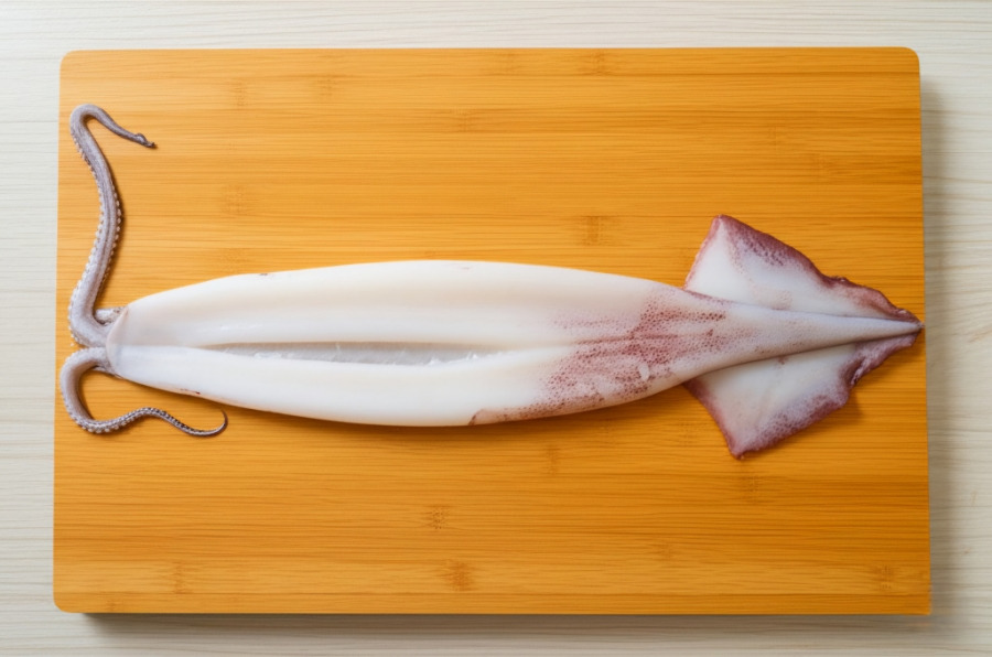 <이미지: 깨끗하게 손질된 생물 오징어 두 마리와 채소 손질에 사용될 칼, 도마가 함께 있는 정물 사진. 요리에 사용될 신선한 재료의 느낌을 강조한다.>