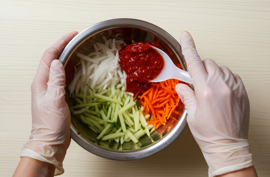 <이미지: 큰 볼에 채 썬 채소와 양념장을 넣고 젓가락이나 숟가락으로 살살 버무리는 모습.>