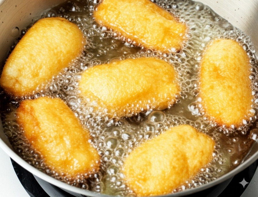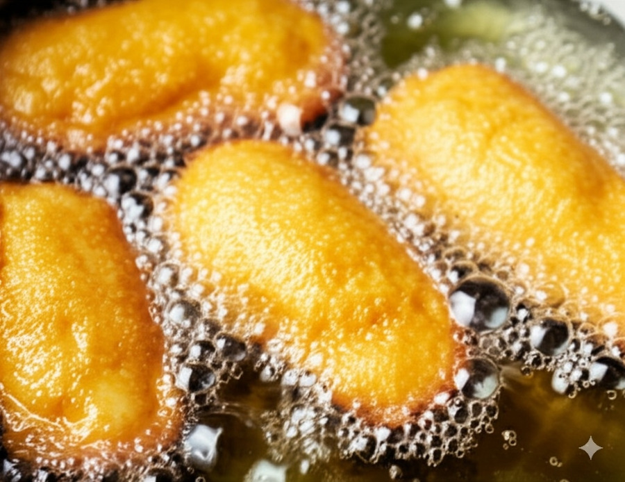 <이미지: 예열된 기름에 튀김옷 입힌 돼지고기를 넣고 튀기는 모습>