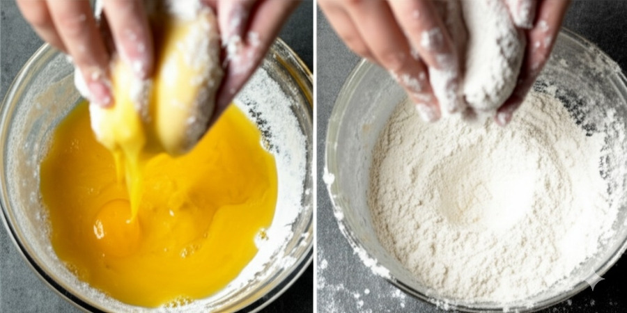 <이미지: 밑간한 돼지고기에 계란 흰자를 넣고 섞은 후 감자 전분을 넣고 튀김옷을 입히는 모습>