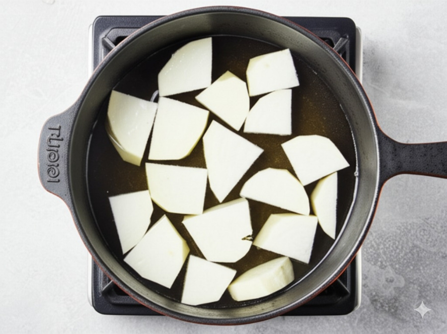 <이미지: 냄비에 무를 깔고 육수를 부어 끓이는 모습>