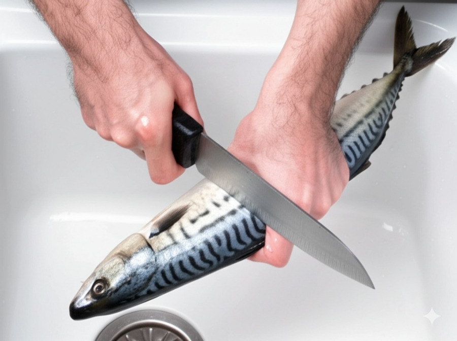 <이미지: 흐르는 물에 갈치를 씻고 손질하는 모습>
