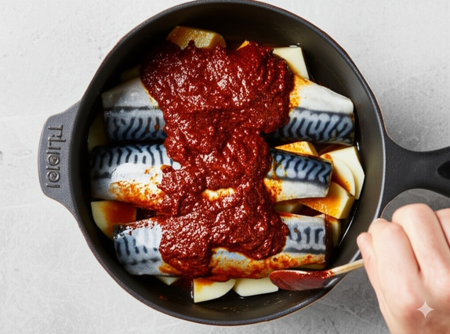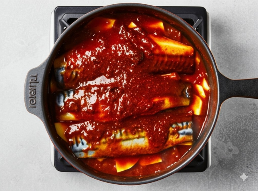 <이미지: 냄비에서 갈치와 무가 양념에 졸여지는 모습>